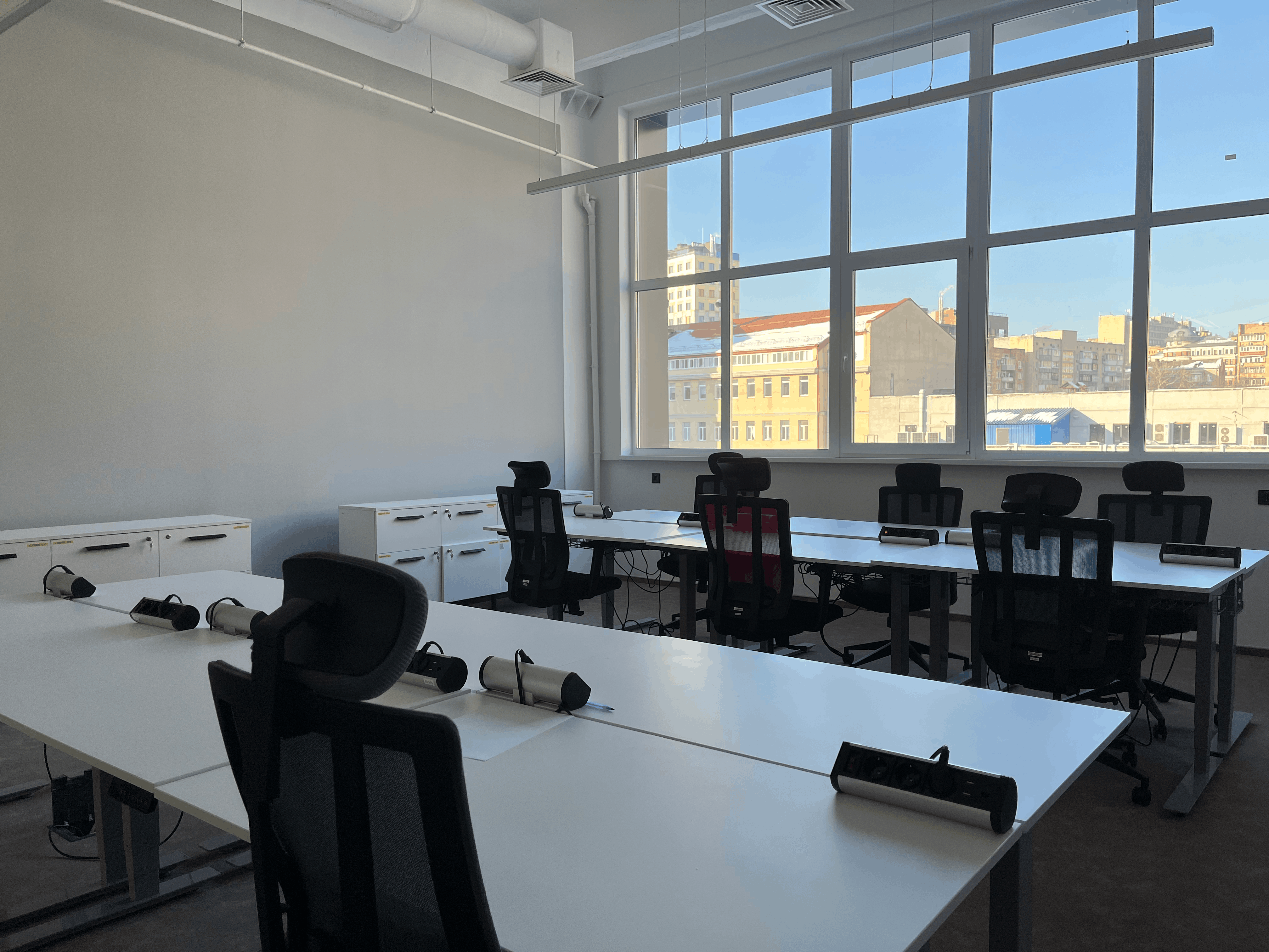 A bright, spacious room with large windows, a projector, and a screen for presentations. This area features colored matte walls that separate you from the main lounge and large windows